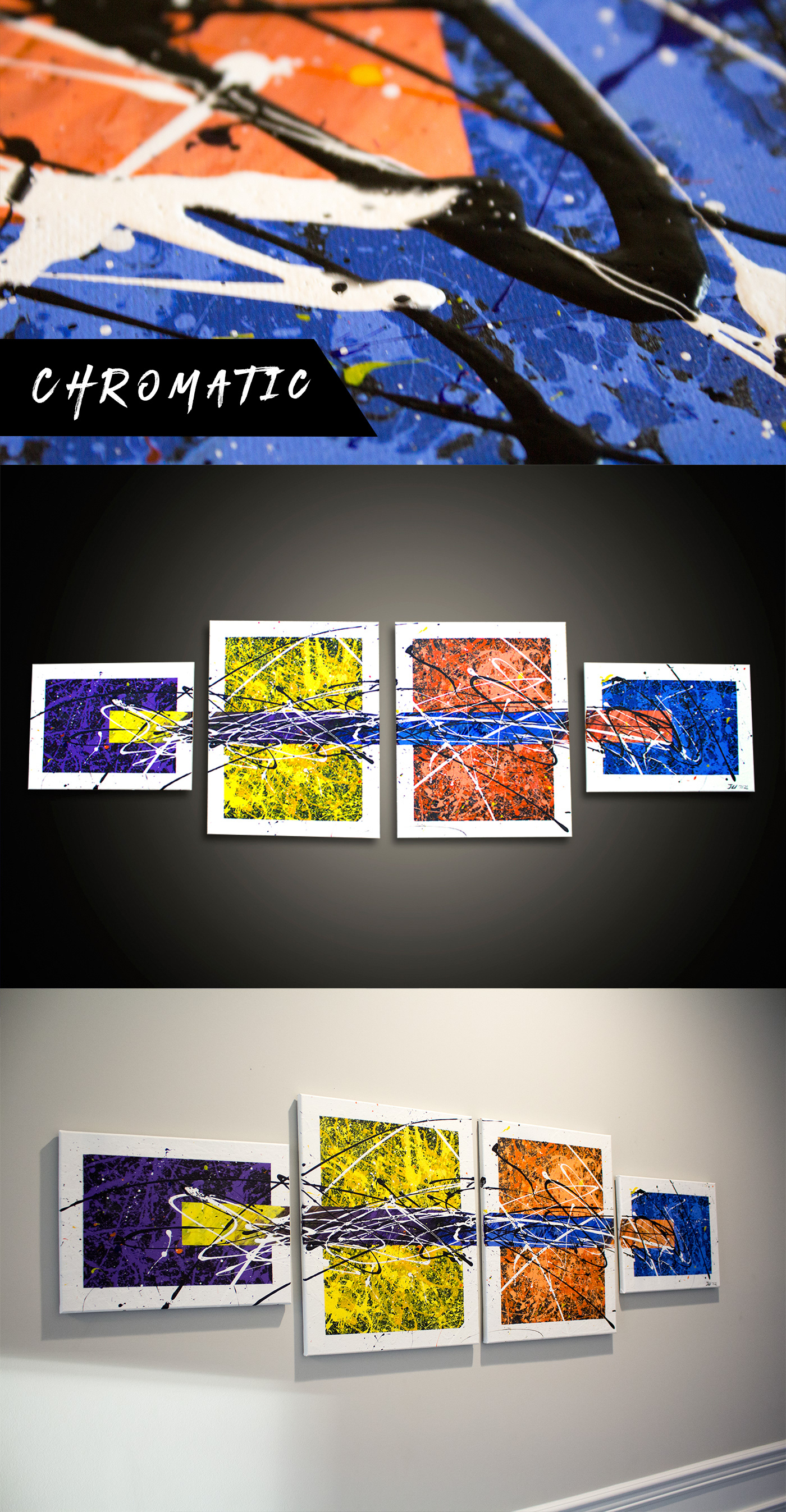 Medium: Acrylic on Canvas (4-Panel Polyptych) Dimensions: Two 16x20" vertical center panels and two 11x17" horizontal end panels Description: “Chromatic” is a multi-panel acrylic abstract artwork composed of four canvases designed to function as one unified composition. The two vertical center panels are flanked by horizontal end panels, creating a balanced yet expansive layout that invites spatial interaction. This expressive piece features splashes and layers of blue, orange, purple, yellow, black, and white — each color occupying its own space while engaging in visual dialogue across the panels. The dynamic brushwork, bold contrasts, and intentional separation of hues reflect themes of tension, energy, and balance. Whether displayed tightly together or spaced out to enhance negative space, “Chromatic” commands attention as a vibrant centerpiece that merges chaos with harmony.