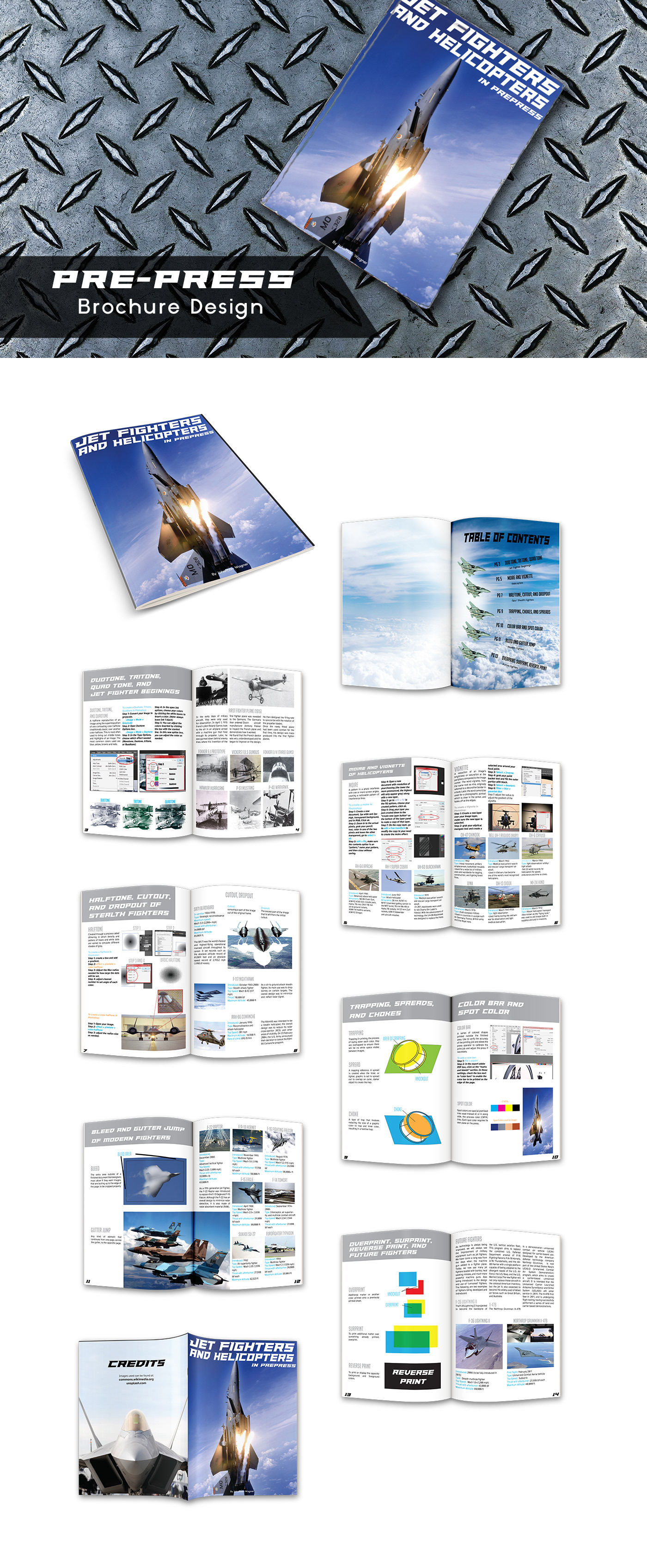 Type: Brochure Design / Print Production Tools: Adobe InDesign, Illustrator Objective: The goal of this project was to design an educational brochure focused on key prepress terms and principles — essential knowledge for preparing artwork for professional printing. The design needed to clearly convey technical information while remaining visually engaging. My Role: I handled the full brochure design and layout using Adobe InDesign and Illustrator, combining informative content with dynamic visuals. To give the brochure a compelling theme, I incorporated high-impact imagery of military jets and helicopters, blending educational material with bold design. Design Approach: The layout was built on a structured grid system with attention to bleed, crop marks, resolution, and color modes — all critical aspects of prepress. The aviation theme added energy and movement, while the typography and layout ensured the content remained clean and readable. Result: This project demonstrates my ability to balance technical accuracy with creative layout design. It showcases skills in print formatting, visual hierarchy, and producing artwork that’s ready for real-world printing.